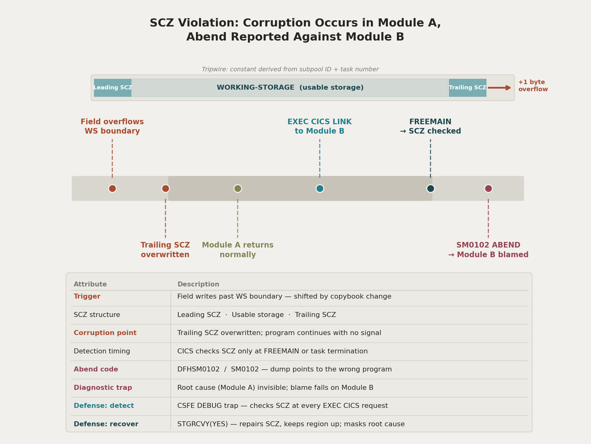 The critical detail: the violation is detected not when it occurs, but only when the SCZ is checked. A program can overwrite the trailing SCZ and continue executing. CICS notices only when the storage is freed, which may be in a different program entirely.