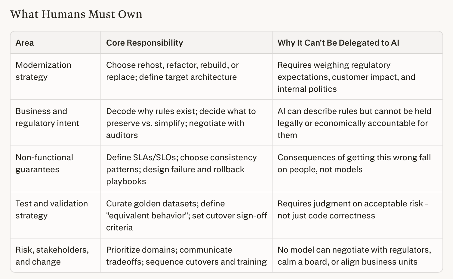 - Humans define why modernize, what success looks like, and what risks are acceptable - strategy, architecture, domain interpretation, and organizational change.