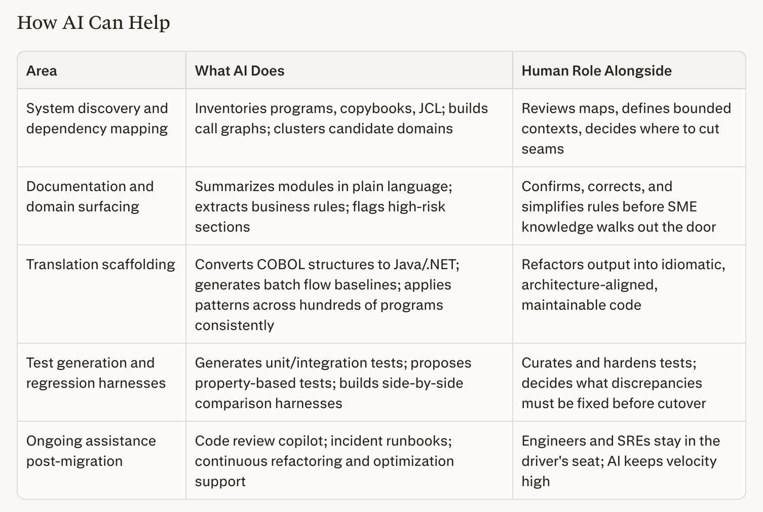 - AI accelerates how you get there - mapping, documenting, translating, and testing at a scale and speed no human team can match.